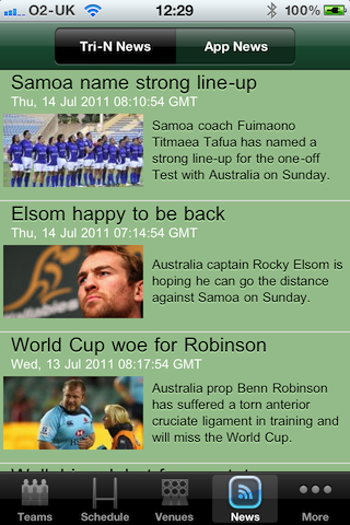 The 'News' view. This page shows an RSS feed of latest news about the Rugby Championship.